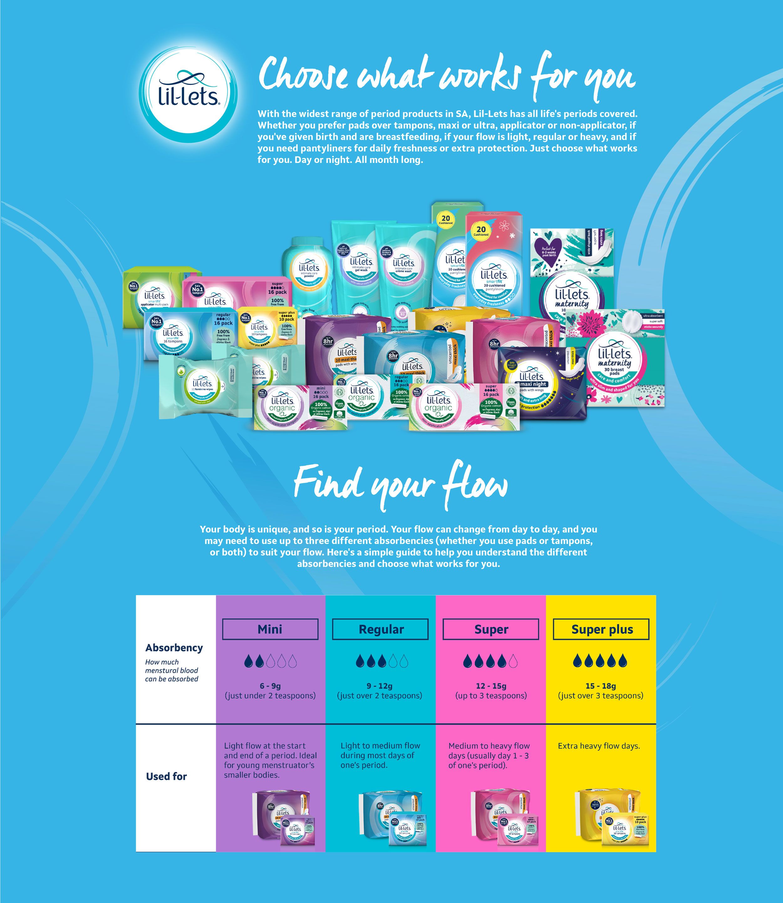 Make them feel proud of this incredible gift – to bring life into this world! Educate and equip them (if possible) with what options are available to them when they get their periods, like Lil-lets’ full range of pads and tampons. But also explain to them what else happens to make this life-giving miracle occur, that hormones are involved and that this can mean that they sometimes feel a bit low in energy or feel down, and that it is normal to get cramps, pains and tenderness in the lead-up to their period.